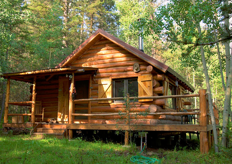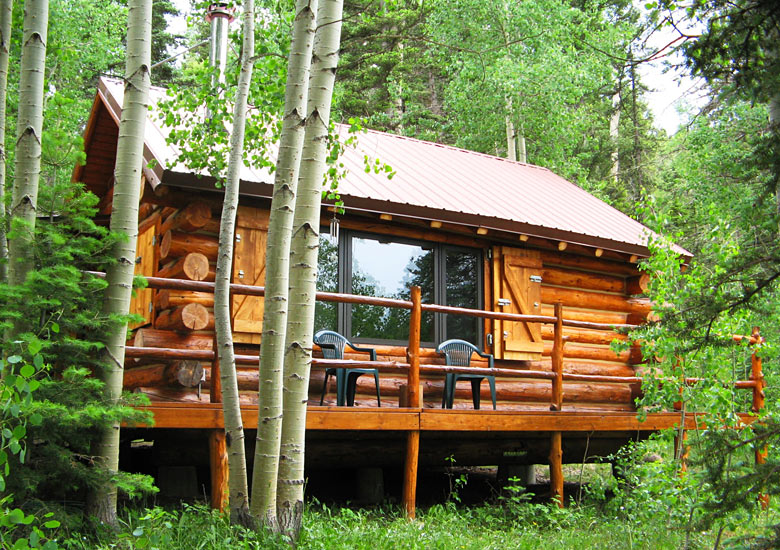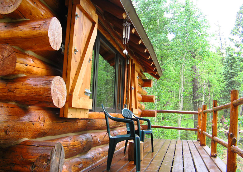 While not far from the Welcome Cabin, it is visually set apart by lacy woods and a unique log bridge built from naturally curved timbers over an all-year mountain creek. The bathroom is decorated with colorful Mexican sink and tiles. Each guest is provided with a luxuriant robe.